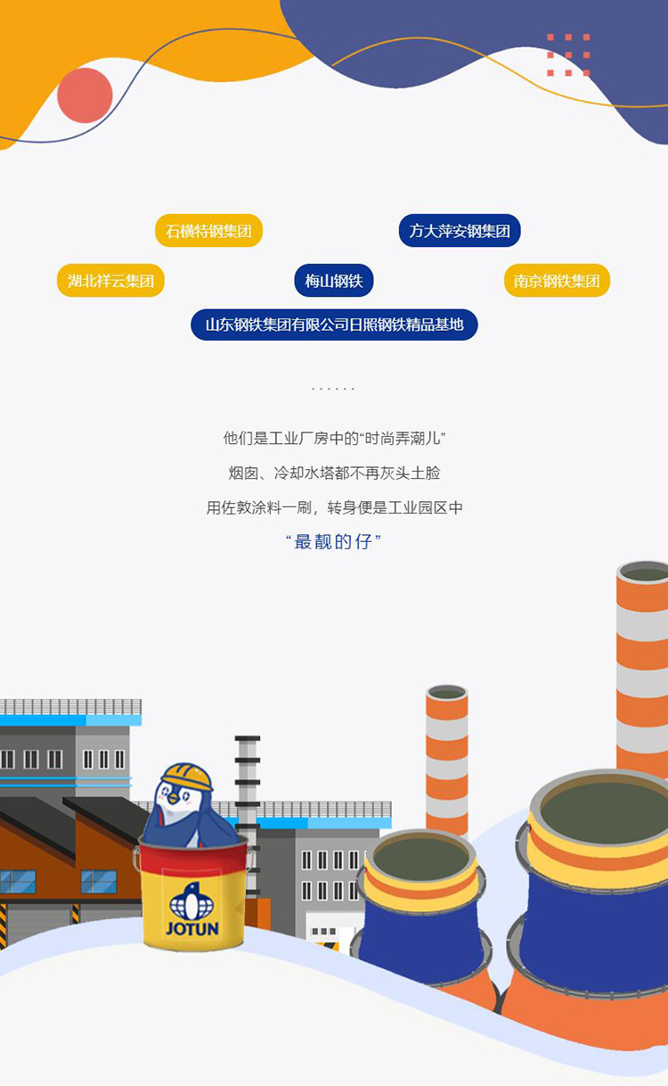 佐敦涂料攜手在業(yè)內(nèi)擁有超過30年高空施工經(jīng)驗的施工團(tuán)隊,為各類正在轉(zhuǎn)型的鋼鐵企業(yè)提供維修、防腐、美化服務(wù)。佐敦為此類美化服務(wù)提供專業(yè)的油漆配套,鋼廠美化專用的高性能涂料體系,不僅可以配合施工隊的快速施工,而且調(diào)色方便、調(diào)色空間大,能基于環(huán)保的基礎(chǔ)上更方便、精準(zhǔn)地展現(xiàn)出業(yè)主及設(shè)計師的設(shè)計理念。